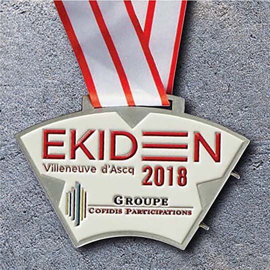 Le relais Ekiden est une épreuve qui représente l’effort de 6 coureurs d’une même équipe, c’est pour cela que notre médaille métal Villeneveuve d’As a été conçue pour pouvoir être assemblée avec 6 autres médailles et ainsi former une rosace.